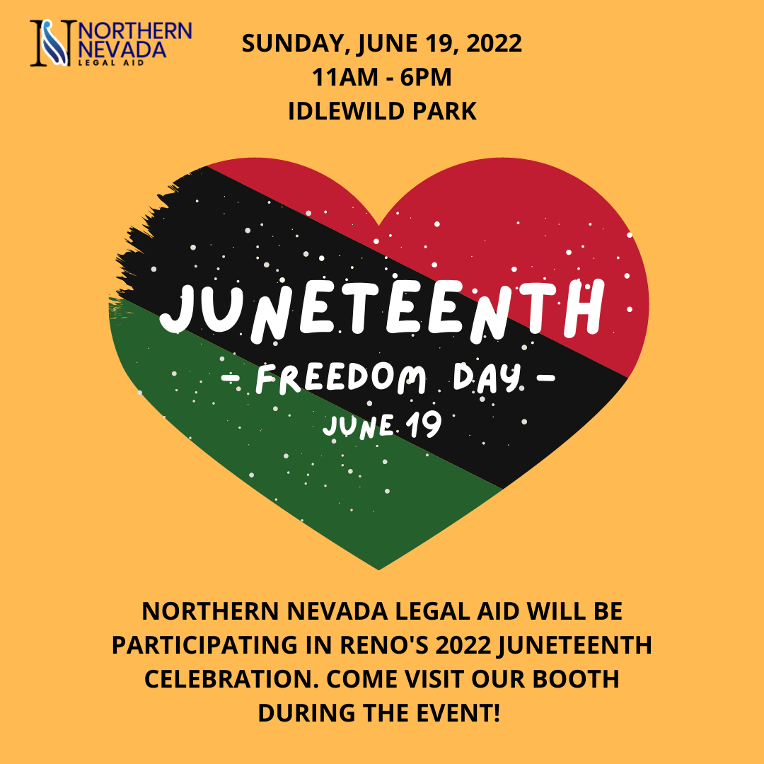 Juneteenth is Reno’s annual celebration of the emancipation proclamation! This is the first year that we get to celebrate it as a federal Holiday! There will be fun for all ages and plenty of entertainment. Washoe Legal Services will participate by having a table highlighting our services and resources available to the community.
